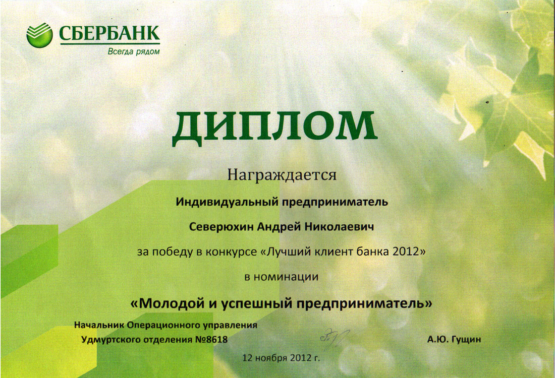 Диплом от «Сбербанка России» за победу в конкурсе «Лучший клиент банка 2012» в номинации «Молодой и успешный предприниматель»